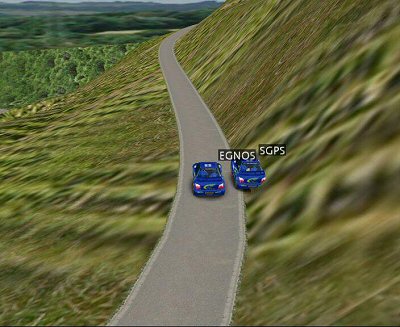 The results were displayed in map simulations, one a plan view, the other a three dimensional view showing cars in a virtual rally environment. In each case the position of the cars according to GPS and according to EGNOS was visible simultaneously, allowing a comparison of the relative positioning accuracies of GPS and EGNOS to be made.